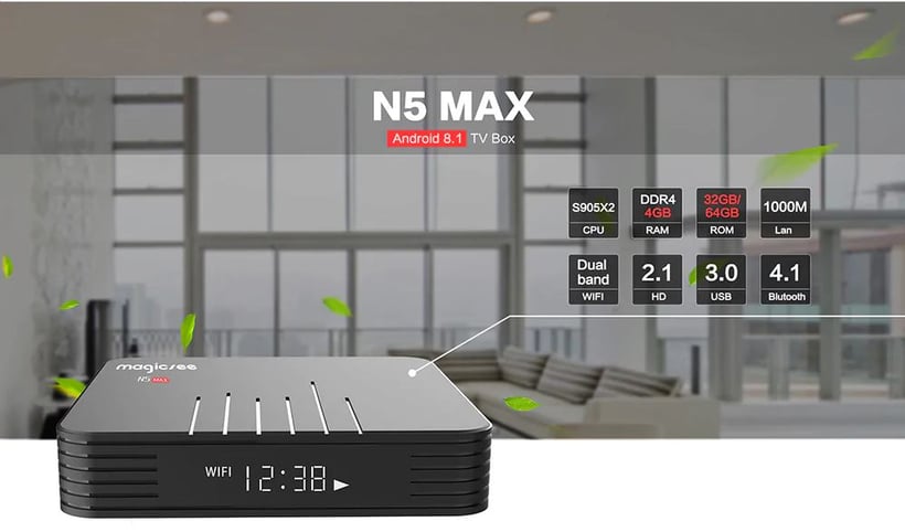 La Magicsee N5 Max est une toute nouvelle TV Box propulsé par le nouveau processeur Amlogic S905X2 avec un GPU ARM Dvalin Mp2 couplé à 4 go de ram . Elle tourne sous une version récente d'Android 8.1, possède le WiFi double band 2.4 et 5 Ghz, ethernet en Gigabit, un port usb 3.0 et un port usb 2.0, un port pour carte micro SD et une sortie optique SPDIF.