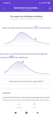 Concernant l'analyse du sommeil, ce bracelet souffre du même défaut que tous les bracelets que j'ai testé jusqu'à présent. Le Mi Smart Band 4 compte comme sommeil léger le moment ou l'on est dans son lit en train d'essayer de s'endormir. Pas de soucis donc si on s'endort facilement mais pour une personne comme moi qui reste allongé longtemps avant de s'endormir, les résultats peuvent être quelques peu erronés. Pour les mesures de sommeil profond par contre le bracelet semble plus précis. On peut quand même donc analyser son sommeilmais en gardant en tête les limitations de l'appareil.
