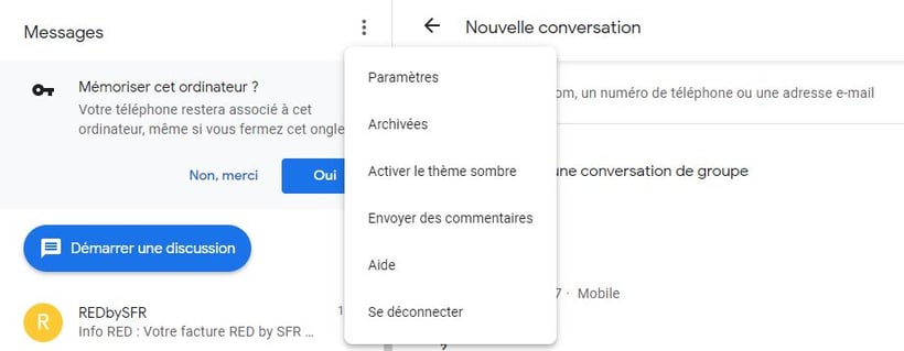 Il faut dans un premier temps installer l'application Messages de Google depuis le Play Store sur son smartphone pour ceux qui ne l'ont pas encore. Au sein de l'application de messagerie il faut accepter qu'elle soit l'application de messagerie par défaut puis cliquer sur les 3 petits points en haut à droite puis sur "messages pour le web".
